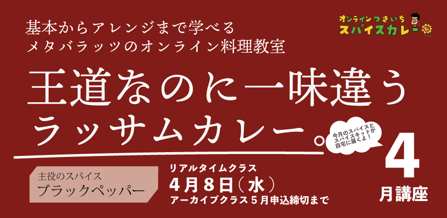 | 2026/02/14 | 【スパイス料理を学ぶ】バラッツのオンライン料理教室 つきいちスパイスカレー#3月の会(3/11) |