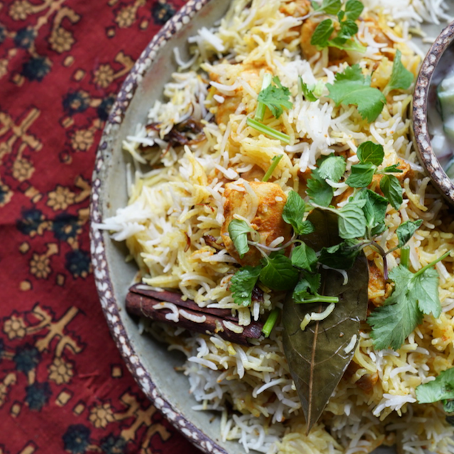 インドの高級米「バスマティライス」を使い、肉(チキン・マトン・魚・エビなど)や野菜をスパイスと一緒に炊き込んだ料理です。サフランやカルダモン、クローブなどの香り豊かなスパイスがたっぷり使われます。